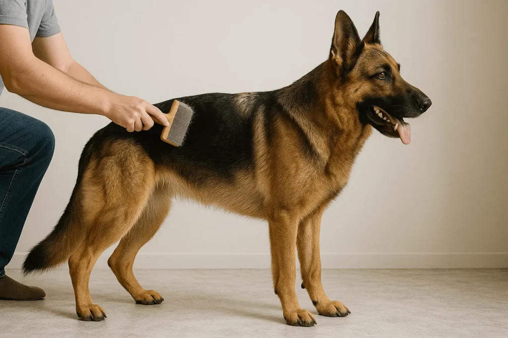 Brushing is the single most effective way to maintain your German Shepherd’s coat between baths. Aim to brush at least 3 – 4 times a week using a slicker brush or undercoat rake. Brushing removes loose fur, dirt, and debris, distributes natural oils evenly, and prevents tangles from forming in the dense undercoat.